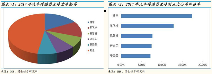 汽车传感器博世最强:在汽车传感器方面,博世以领先优势位居第一,全球市占率达到17.4%,英飞凌和恩智浦位居第二和第三,前五大公司合计占比62.7%。
