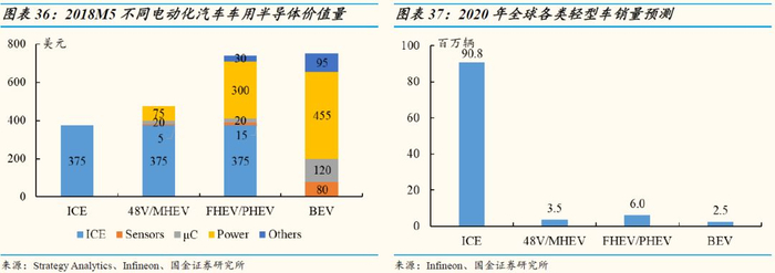 电动车新增半导体主要是功率器件,未来电动车的渗透也将是功率器件最为重要的成长动力:根据汽车半导体可以分为五大类,分别是功率器件(Power)、传感器(Sensor)、处理器(Processor,Main for MCU)、ASSP(主要是Connectivity和Amplifier)、Logic和其他。汽车中采用大量的半导体器件,根据Strategy Analytics和Infineon的最新数据(2018年5月),燃油车单车半导体价值量约375美元,纯电动增加一倍,约750美元。其中,传统燃油车中功率器件单车价值量71美元,48V轻度混动车中功率器件单车价值量146美元,重度混动车和插电混动车中功率器件单车价值量371美元,而纯电动车中功率器件成本为 455美元,占比车用半导体61%,相较于燃油车增长541%。