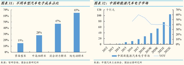 纯电动车中汽车电子成本占比达65%:从各种车型的成本结构来看,纯电动汽车的汽车电子成本占比达到了65%,而目前的传统燃油车中紧凑型车为15%,中高档汽车为28%,因此新能源车的普及将会大大提升对汽车电子的需求。2017年中国新能源车用电子零部件市场规模达到181亿元,预计到2022年市场规模将达到1045亿元,未来五年新能源汽车电子的市场规模复合增速将达到42.0%,远远高于中国汽车电子行业平均增速。
