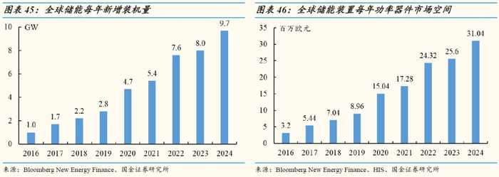 在储能领域,2017年每MW储能容量所需功率器件价值量为3200欧元,2017年储能用功率器件市场规模544万欧元,至2024年将达到3104万欧元,17-24年CAGR为28.2%。目前全球储能量占发电量比例不足5‰,随着储能量的逐渐增加,这一领域功率器件的市场规模在未来长时间内保持高速增长。