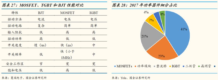 MOSFET、IGBT、整流桥是功率半导体器件中最为重要的三个细分产品,2017年MOSFET在功率器件中的占比达到41%,整流桥21%,功率模块占比23%,IGBT则为7%。