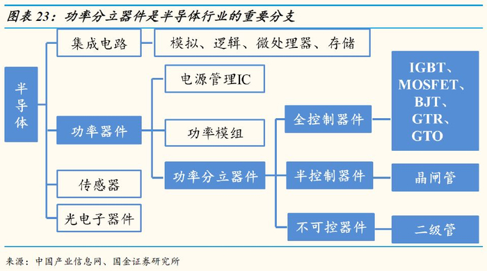 功率器件可以分为电源管理IC、功率模组和功率分立器件三大类,其中功率分立器件又可以分为全控制器件、半控制器件和不可控器件。