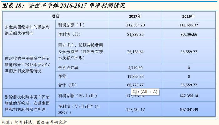 安世半导体2016-2017年模拟净利润分别为8.03亿和8.19亿;若剔除收购产生的摊销影响,则分别为10.7亿和12.7亿。