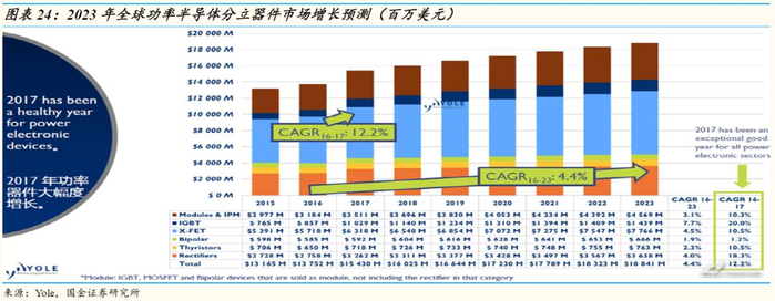 2017年,功率分立器件市场规模约154亿美元,同比增长12.2%,主要是电动汽车及IOT等新兴市场需求,预计到2023年将达到188亿美元,2016-2023年年均复合增速4.4%。