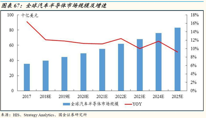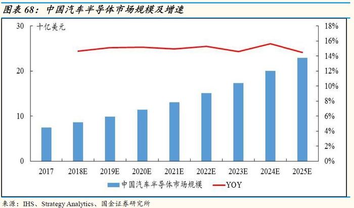 2017年中国车用半导体市场规模75亿美元,17-25年复合增速达到15.0%:2017年,中国车用半导体市场规模75亿美元,占比全球车用半导体市场21.1%;预测2025年中国车用半导体市场规模将达到229亿美元,占比全球车用半导体市场提升至26.1%,17-25年复合增速为15%,要明显高于全球的平均增速。