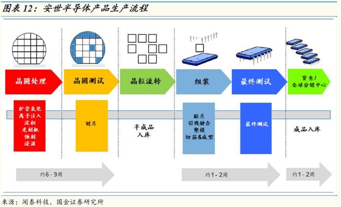 安世半导体集半导体标准件的设计、生产、销售于一体,其中生产为其核心业务环节。生产环节可以分为前端晶圆加工和后端封测两个阶段。晶圆加工阶段包括晶圆处理(炉管氧化、离子注入、淀积、光刻机、蚀刻、浸湿)、晶圆测试及晶粒流转;后端封测包括组装(贴片、引线键合、塑模、切筋成型)、最终测试环节。
