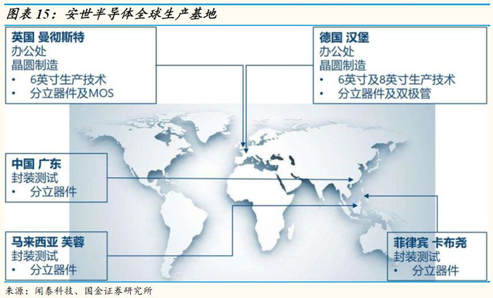 安世半导体在德国、英国各拥有一处晶圆制造基地,在中国、马来西亚、菲律宾各拥有一处封装测试基地,此外还使用荷兰、新加坡的晶圆代工,以及泰国的封测代工。