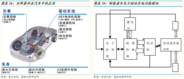 功率器件在汽车中的主要应用领域有:1)驱动系统:电动机控制、变速箱控制、制动控制和转向控制;2)引擎系统:引擎控制;3)车身:前大灯控制、室内灯控制、AV及附件控制。