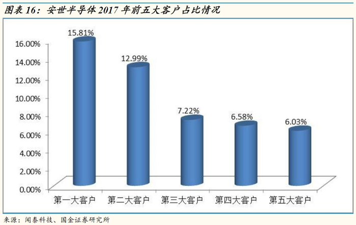 安世半导体客户营收占比合理,2017年,安世半导体第一大客户营收占比15.8%,第二大客户占比12.99%,第三大客户占比7.22%,前五大客户合计占比48.63%。