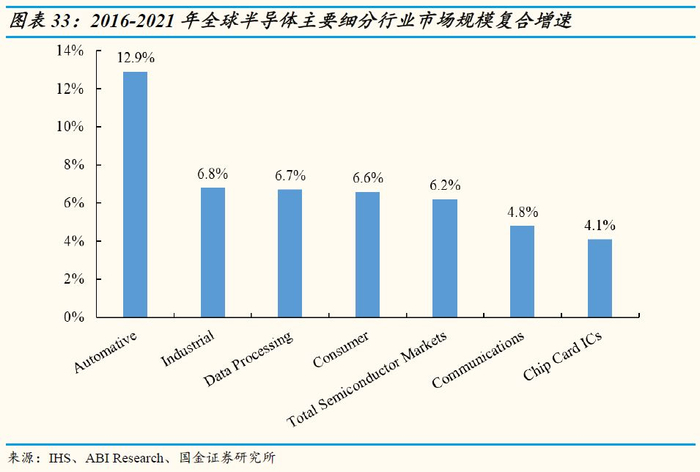 汽车半导体是汽车电子中的一个重要分支,16-21年全球汽车半导体市场复合增速达12.9%:2017年全球汽车半导体市场规模355亿美元,同比增长16.4%,在全球半导体产业中占比8.7%。国金证券半导体陆行之团队预测2021年全球汽车半导体市场规模将达到559亿美元,在半导体产业中的占比将提升至11.4%。2016-2021年汽车半导体市场规模复合增速12.9%,远远高于半导体行业的平均增速(6.2%,数据来源于IHS和ABI Research),以及半导体其他主要的应用领域如工业领域(6.8%),数据处理(6.7%),消费(6.6%),通信(4.8%),智能卡(4.1%)等。
