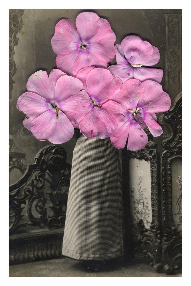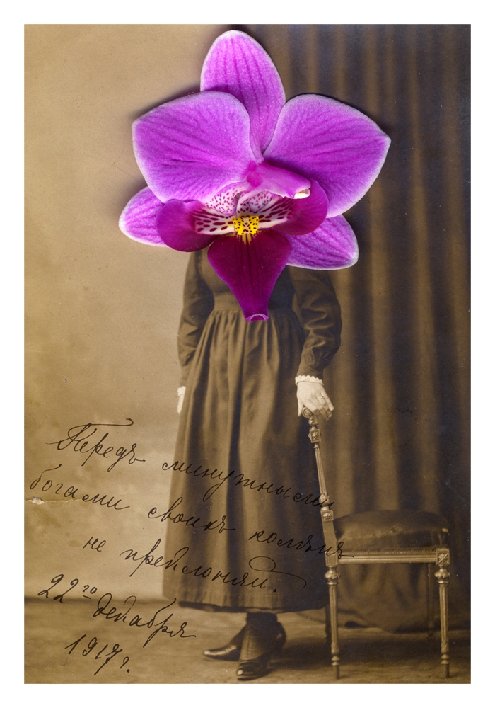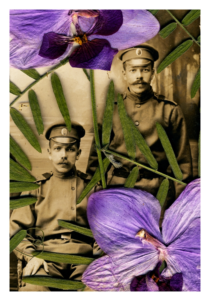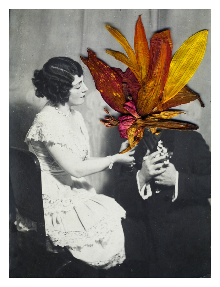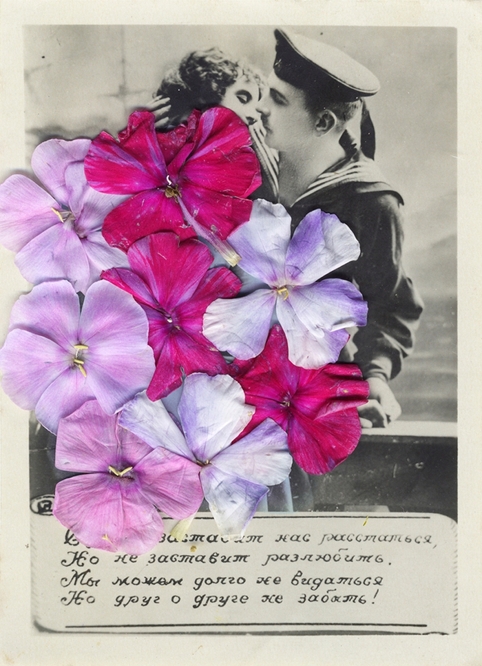 博里索娃出生在爱沙尼亚的塔林,目前在俄罗斯圣彼得堡工作和生活。她在跳蚤市场“寻宝”是为了创作自己的作品《奔至边缘》(Running to the Edge)。在1920年代,因为战乱和时局不稳,有不少人离家,选择移民或逃亡。博里索娃以这一群体为创作对象,将买来的移民老照片和一些花朵、花瓣叠加在一起,当黑白或褐色的相纸与明亮的、五颜六色的花朵并置,让人感到鲜活的当下浸入暗淡的岁月。她用这种微妙的对比来引导观看者浸入到一段已经渐淡的历史中。