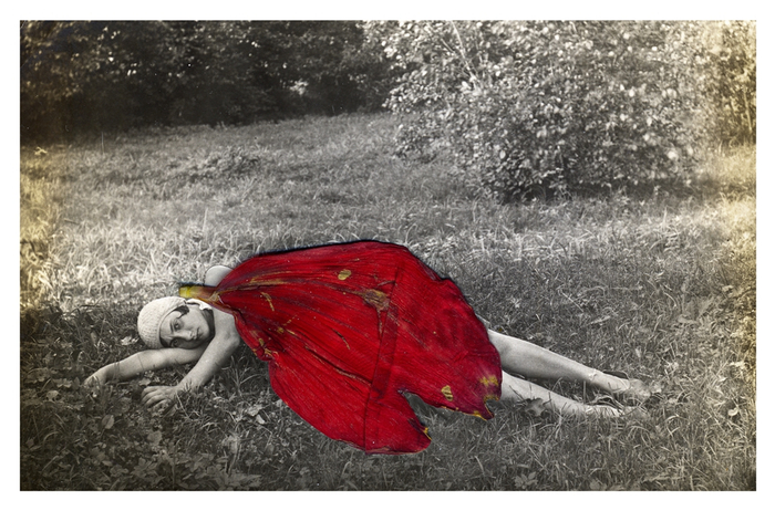 茱莉亚·博里索娃:在创作《奔至边缘》时,我脑海里一直萦绕着一些问题——我们的记忆到底是如何起作用的?时间的流逝会让记忆逐渐丧失一些细节,当回忆往昔之时,很可能会添加一些想象出来的细节替代真实发生过的事,而形成一个新的记忆。我则试图用具体的图像来解释这个过程:给老照片加上花瓣,花瓣就像是想象出来的记忆,老照片也因此有了新的含义。