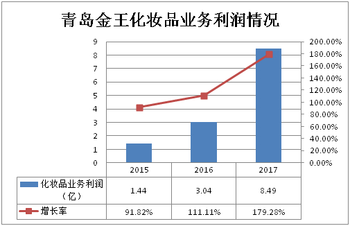 2015年至2017年三年,青岛金王化妆品业务利润由1.44亿猛增至8.49亿,增长率由91.82%增加至179.28%,近乎翻倍。从各项数据上来看,无论是从营收占比、利润占比,还是从利润增速来看,化妆品业务都无疑是青岛金王现阶段的主力业务。可以说,化妆品业务发展的趋势,是可以决定青岛金王整体发展趋势的。