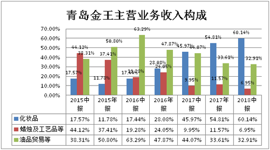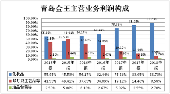 青岛金王原主营业务为新材料蜡烛及工艺品和油品贸易两大板块,自2012年开始业务转型升级,青岛金王先后收购杭州悠可化妆品有限公司、上海月沣化妆品有限公司、广州韩亚生物科技有限公司等化妆品相关行业公司之后,青岛金王即形成了化妆品业务、新材料蜡烛及工艺品业务、油品贸易业务三条业务线。自2015年中报开始,青岛金王正式将化妆品业务纳入公司主营业务收入构成中,经过不断地发展,青岛金王化妆品业务收入占比逐渐从最初的17.57%提升至2018年中报的60.14%,成为青岛金王第一大业务收入来源,与此同时,化妆品业务所贡献的利润占青岛金王利润总额的比例也由2015年中报数据的55.95%一路攀升至2018年半年报的88.73%,化妆品业务成为青岛金王最重要的利润来源。