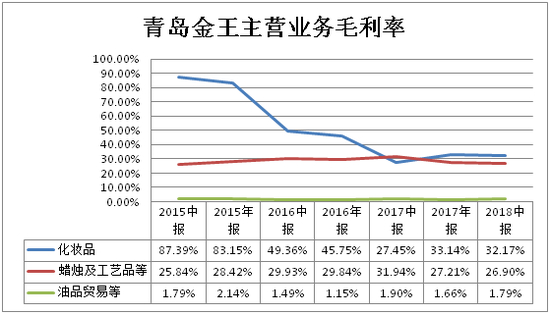截至2018年半年报数据,青岛金王总营业收入为27.41亿元,比上年同期增长了37.04%,将青岛金王三大业务营收增长拆分开来看,新材料蜡烛及工艺品业务营收比上年同期减少了4.27%,油品贸易业务营收与上年同期相比增幅只有2.32%,化妆品业务营收比上年同期增加了79.27%,也就是说,青岛金王营业收入的增幅,基本上都是依靠化妆品业务的收入同比大幅增加而实现的。而在青岛金王化妆品业务营业收入不断攀升的同时,该业务板块毛利率却是一路下滑。