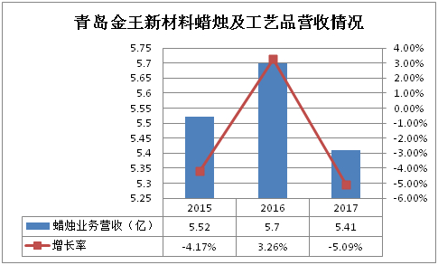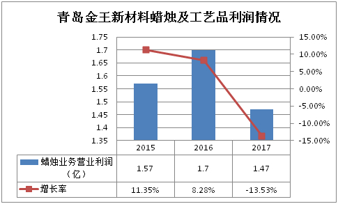 反观新材料蜡烛及工艺品业务,虽然青岛金王一直标榜其与化妆品业务一样,同属于公司核心业务板块,且该业务外销市场存在一定刚性需求,但是,通过以下二图,我们发现新材料蜡烛及工艺品业务利润增速在不断下滑,2017年利润增速出现了负增长,结合新材料蜡烛及工艺品业务无论是从营收占比上来说,还是从利润占比上来说,都呈大幅下滑趋势,新材料蜡烛及工艺品业务目前无法对青岛金王整体的营收及利润形成有效的支撑。