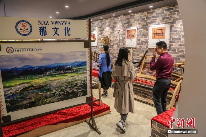 12月4日,广西贵港市蒙公民族中学博物馆壮族民间文化区,几名参观者正在观展。“蒙公民中博物馆”位于广西贵港市覃塘区蒙公乡民族初级中学内,筹建于2014年5月,主要以壮族民居“瓦房式”格局布置,分为壮族生活用具区、壮族农耕用具区、壮族民间文化区三个区域。蒙公乡民族初级中学是广西贵港市唯一一所进行壮汉双语教育教学的初级中学,2014年被广西壮族自治区教育厅定为省级创建民族文化教育示范学校。 中新社记者 陈冠言 摄