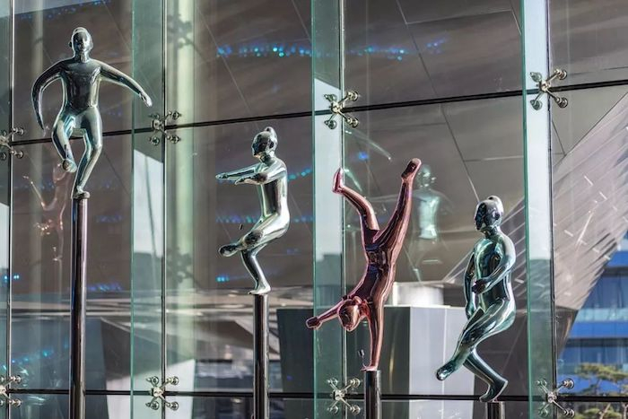 仔细看看潮堂里的艺术作品。传说是唐朝元素的“通天高杆”上人们正向上爬,或旋转或舞蹈;往里走就能发现抖音爆款的艺术品了,这个作品如果不停下来,是不会发现其中奥秘的: