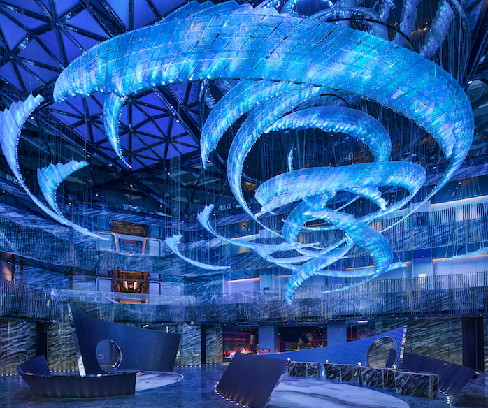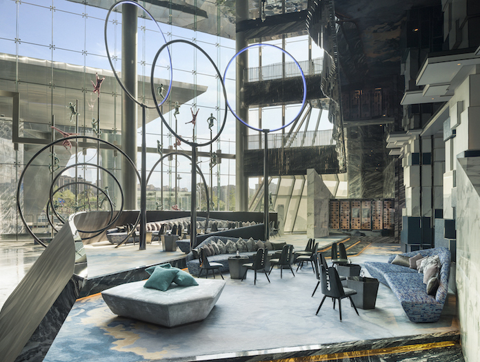 先从潮堂说起。W酒店对大堂一直有自己的叫法,“潮堂”就是这里的大堂。整个有17米挑高、1万7千平方米的Living Room,一进去就让人眼花缭乱。