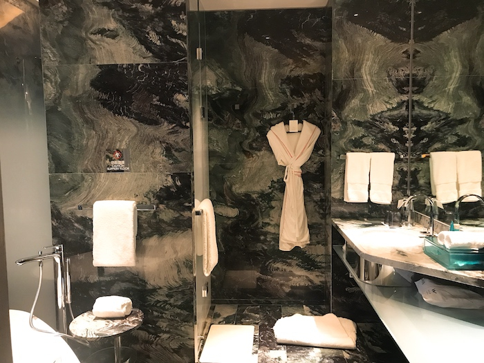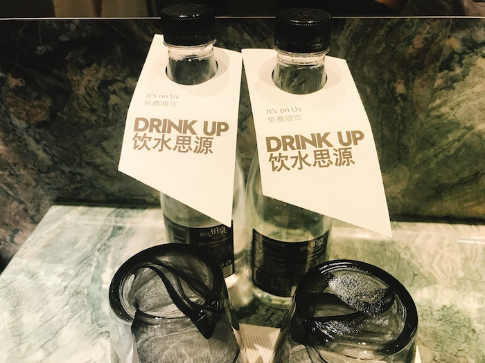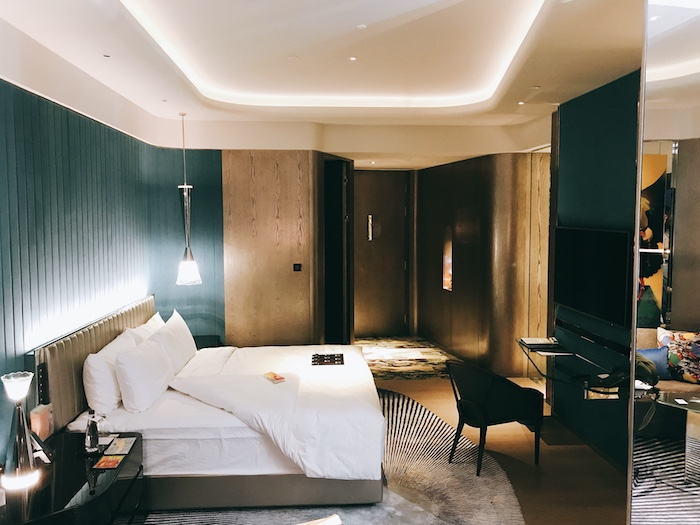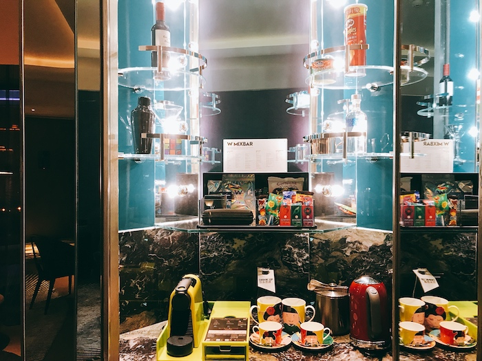 Mini-bar藏在了一个不易被发现的地方,打开它金闪闪的直晃眼睛,把这里当作穿衣镜一点都不为过,可爱的唐朝玩偶杯和咖啡、酒、茶等一应俱全。房间内的BOSE音响和自动马桶上带的音乐开关,套房和SPA里的戴森吹风机,也让房间带了点儿科技感和时尚感。