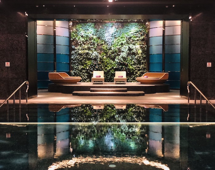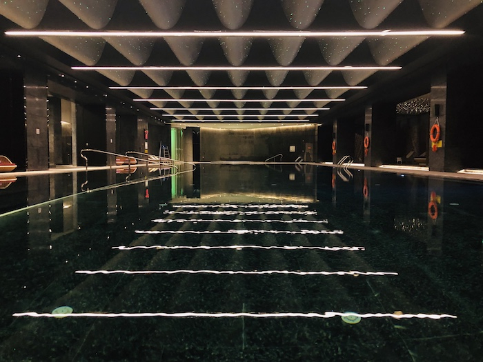 酒店内的泳池、健身房和AWAY水疗中心都在B1层,酒吧与潮堂相连。室内泳池40米×13米,可以说是酒店内少有的大空间,户外泳池相对较小,但躺在唐贵妃的阳伞下晒太阳也实在是惬意的很。健身房和SPA也很值得体验一番,而酒吧里的鸡尾酒和下午茶别忘了拉上三五好友美美品尝一下。