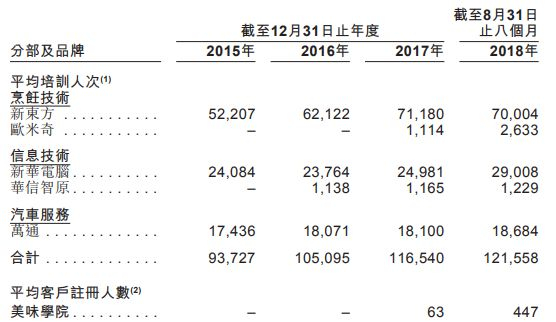 从平均培训人次来看,新东方烹饪也为中国东方教育贡献大部分客户,2015年到2018年截至8月31日,中国东方教育合计月平均培训人次由9.3万人增长为12.2万人。而新东方烹饪同期的月平均培训人次为5.2万人、7万人。