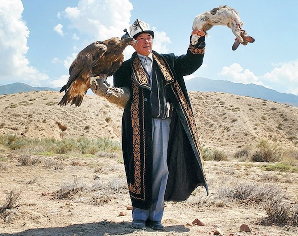 那骑手越来越近,我们发现他并非独自而来:他胳膊上稳稳栖着一只巨大的金雕,雕的羽毛被风吹乱,头上盖着个粗糙的皮罩。几千年来,吉尔吉斯牧民饲养鹰隼,帮他们捕猎兔子、鸟儿和其他小型猎物。驯鹰人从鹰巢里捉住无助的小鹰雏,从那天起就成了它的养父。除了飞行的时候,鹰都要戴着头罩,什么也看不见,只能依靠主人获取食物、知晓方向。这个场景与我们身后相对现代化的村庄形成鲜明对比:驯鹰人身穿传统绣花外衣,头戴名叫“kalpak”的白毡帽,看上去与他身下的马和身边的风景浑然一体。