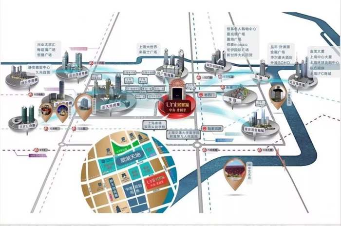 商业上,周边3公里范围内包括新天地步行街、豫园商圈、人民广场、董家渡、淮海路商圈等,基本形成了一个闭环。