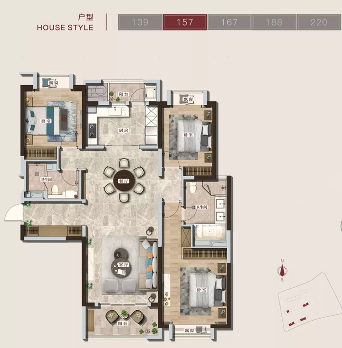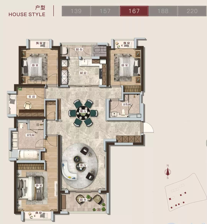 167平方米四房,比157平方米户型多了一个东/西向小书房。
