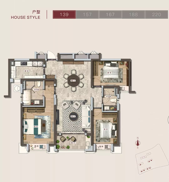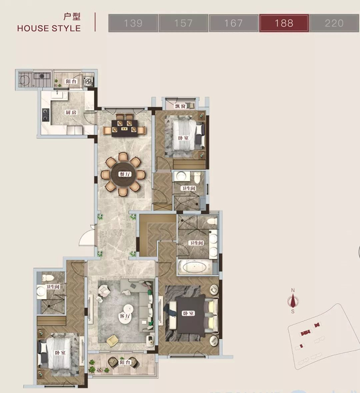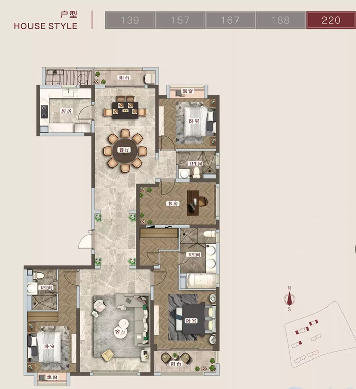 220平方米四房,比188平方米户型多了一个东/西向书房,两个阳台位置有变化。
