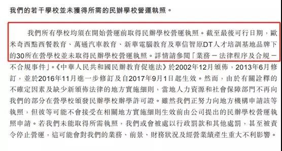 按照相关规则,中国东方教育的所有学校都需要在开始运营之前取得民办学校运营执照,但截至最后可行日期,有30所在营学校未取得营业执照。