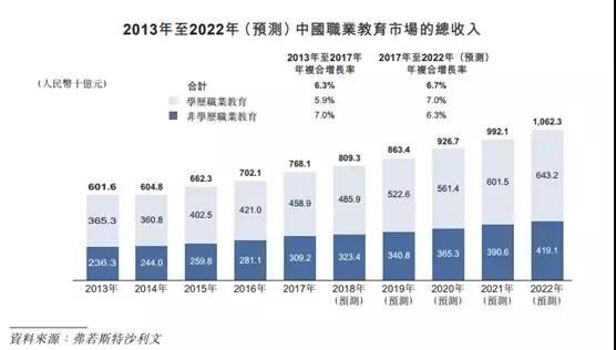 根据教育部资料及弗若斯特沙利文报告称,由于培训人次及学费增加使中国职业教育行业从2013年的6016亿元稳步增至2017年的7681亿元,2013年至2017年的年复合增长率为6.2%,且预计2022年价格达到人民币1.06万亿元,2017年至2022年(预测)的年复合增长率为6.7%。