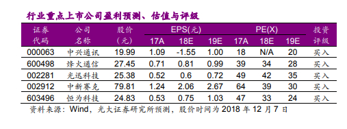 2)光器件/模块:5G 基站侧对 25G 等高速率光模块需求量将显著增长,回 传网流量高速增长推动高端电信模块需求爆发,同时,数通市场受益海外大 型数据中心建设提速,以及国内大数据、人工智能等新技术高速发展推动国 内大型数据中心需求逐步出现,数通产品有望持续快速增长,拥有核心技术 壁垒的行业龙头业绩增长前景更明朗,推荐光迅科技(002281),关注中际 旭创(300308)。