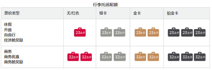 商务舱:两件行李,单件重量不得超过32公斤