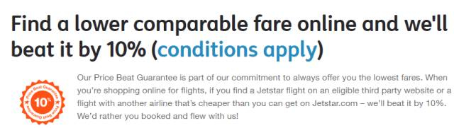 如果其他航空公司在同一航线,相近时间段的机票价格比Jetstar低,那么Jetstar会给予你该航空公司票价的9折!使用Price Beat需要至少提前一周喔!