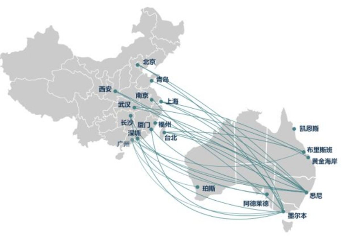 澳航现运营悉尼往返北京、上海、广州的直飞路线。而且与东航有每周多达47班的代码共享航班,从澳大利亚飞往上海、武汉、昆明、杭州(北京)和南京(北京)等城市。