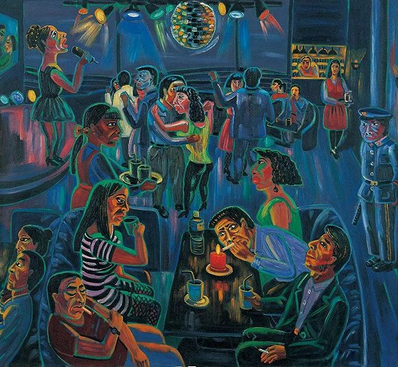 因此,对于上世纪八九十年代舞曲的回访,实则也是对于那个时代精神和社会状况的窥探。人们从何种政治状态中被解禁出来,又将如何迎接即将到来的消费主义和资本主义狂潮?九位艺术家的作品或许能为我们提供部分解答。李晓斌以摄影的方式记录了那个舞曲狂潮。在一幅他拍摄于1982年冬天北京颐和园知春亭餐厅的照片中,画面右下方有两位正在交谈的女性,在她们头顶,挂着一块牌匾,写着:“禁止划拳、行令、播放音乐、跳舞”。而画家陈曦则在1993年创作了一幅名为《歌舞厅》的油画,在热闹喧腾的午夜场,一位身穿制服拿着警棍的保安出现在画面右侧,机警地注视着舞池中那些跟随音乐摇摆的人群——一种秩序和放纵的强烈张力。艺术家郝敬班则在自己的影像作品中对北京舞厅进行了一番考古学研究,她将其追溯到50年代甚至70年代末的交谊舞风潮。如今随着互联网空间的发展和新媒体的普及,昔日那舞者的身体被激活,它们出现在广场上、工地上,也出现在直播屏幕中,继续跳着或快乐或忧伤的舞步。