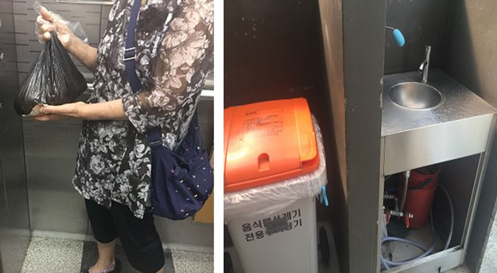 第三种是居民购买重量制食物垃圾袋的方式。居民可以将食物垃圾装在袋子里丢弃。为方便居民丢弃食物垃圾,很多小区的食物垃圾回收桶旁边常设有洗手池和肥皂(如下图)。