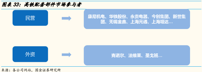 高铁配套部件—民营企业百花齐放。高铁配套部件市场格局相对分散,从业企业众多,大部分为民营企业,以及部分外资企业。行业具有一定的资质壁垒,竞争格局相对稳定,产品更新升级周期更快,业绩弹性相比整车与核心零部件更大。