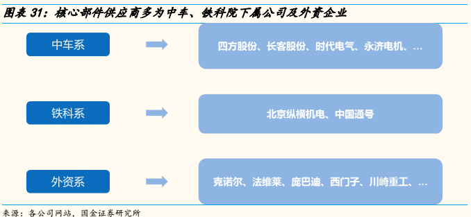 高铁核心部件市场格局:中车、铁科、外资三分天下。由于事关列车行车速度与安全,核心部件供应商主要为中车下属公司、铁科院下属公司,以及部分外资(中外合资)企业。例如动车组牵引系统在核心部件中占比最高,其主要供应商为:中车时代电气(中车下属)、北京纵横机电(铁科院下属)、西门子中国(外资)、新誉庞巴迪(中外合资)。