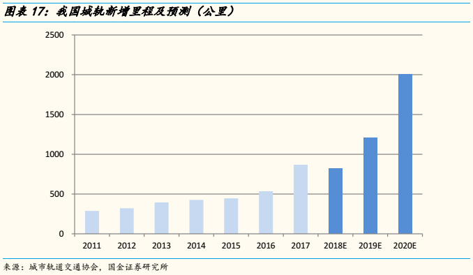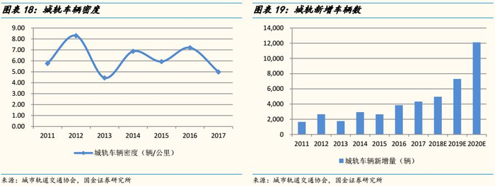 2017年底,我国城轨车辆保有量为28125辆,年均复合增长约19%。新增车辆密度在5.0辆/公里~7.2辆/公里之间、均值6.05辆/公里,测算未来2018-2020年城轨市场采购需求规模分别为4968辆、7302辆、12117辆。
