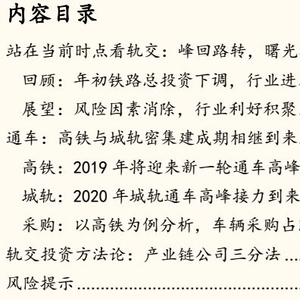 行业策略:回顾2018年,轨交行业经历风雨终见彩虹,上半年铁总下调计划总投资及发改委收紧地铁项目审批,给整个板块造成较大的估值与业绩压力。下半年,行业有利因素积聚,一是基建补短板加速,铁总计划总投资重新上调至8000亿;二是货运增量行动推出,铁路货运市场迎来景气周期;三是铁总经营质量提升,盈利水平与期末现金大幅增加,对于设备采购有较大的增量支出空间。
