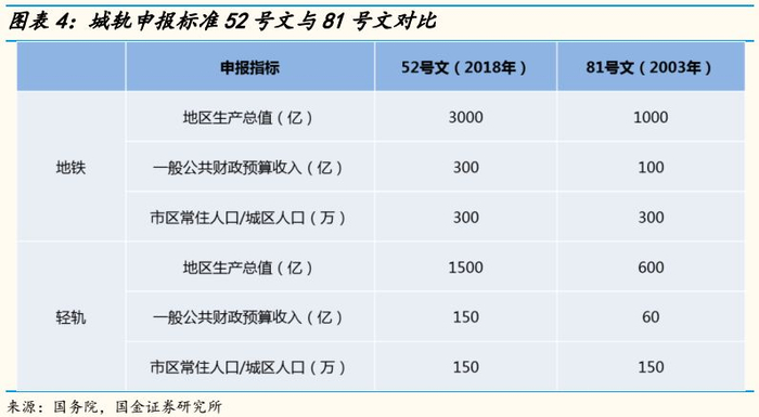 2、城轨申报新规落地、新项目开启批复:2018年7月,《国务院办公厅关于进一步加强城市轨道交通规划建设管理的意见》(52号文)正式公布,相比2003年的81号文申报门槛提高。但政策落地后,新项目审批得以正常进行,同月《吉林省长春市第三期城市轨道交通建设规划》审议通过,线路总长135.4公里,总投资787亿元。
