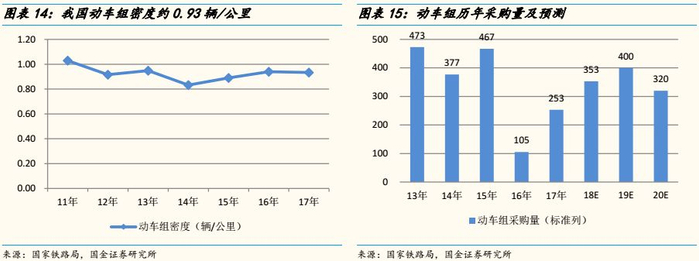 2017年我国动车组密度约为0.93辆/公里,对应未来三年高铁动车里程,预计每年招标规模在300列-400列。