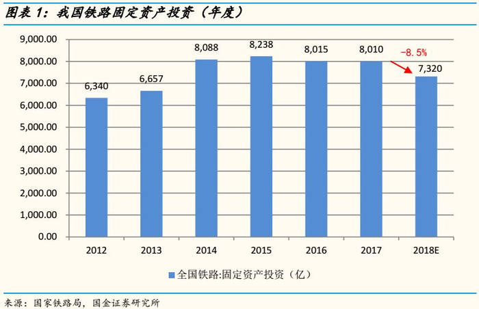 1、铁路总投资的下调:2018年1月2日,铁路总公司召开2018年全路工作会议时透露,2018年全国铁路固定资产投资仅安排7320亿元,相比2018年减少8.5%。