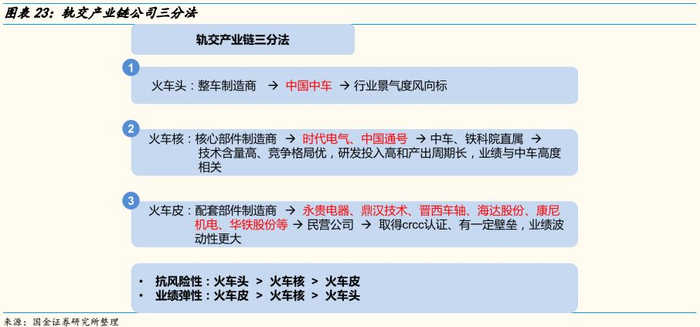 轨交方法论:产业链公司三分法。从产业链上各公司所处位置,把轨交行业内公司划分为三类:一是整车制造商(火车头),二是核心零部件制造商(火车核),三是配套零部件制造商(火车皮)。三种类型公司投资属性有别:行业景气上行期,偏好业绩弹性:配套零部件>核心零部件>整车;行业景气下行期,偏好抗风险性:整车>核心零部件>配套零部件。