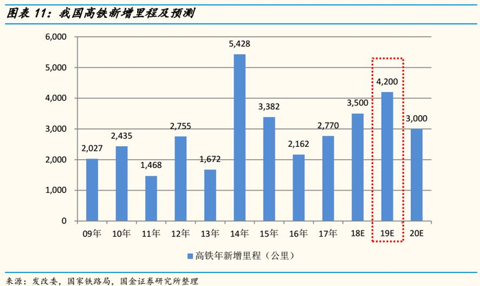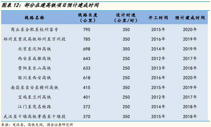 高铁建设通车有一定的周期性:2009-2010年国内大量的高铁项目开工,经过五年左右的建设期,对应于2014-2015年的第一轮高铁通车高峰。2014-2015年是高铁项目新一轮的密集批复期,将对应2019年前后新的高铁通车高峰。
