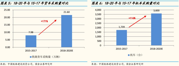 应对新增11亿吨货运量,预计铁路货车新增需求量将达到21.6万辆,机车需求量3600台。对比2015-2017年,未来三年铁路货车市场景气度将有明显提高。