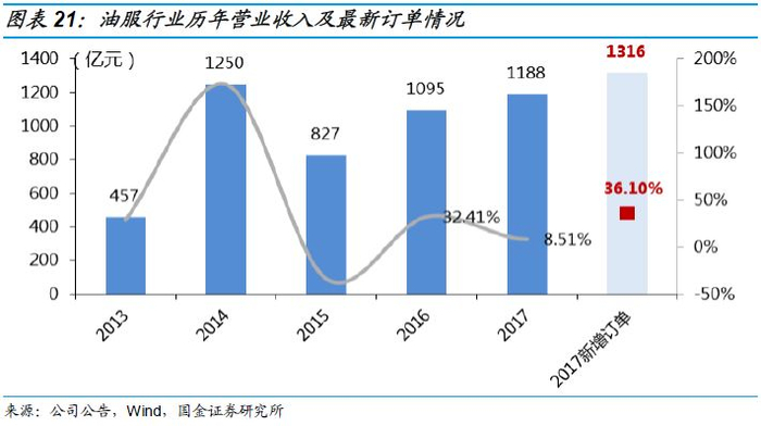 油服行业自2017年触底回升,公司在手订单饱满。我们将22家油服上市公司作为研究对象,其中5家公告(石化油服,杰瑞股份,惠博普,中油工程,海油工程)订单情况。根据我们的统计,2017年,5家公司营业收入总计1,187.74亿元,同比+8.51%,2017年新签订单总计1,316亿元,相比2016年的新签订单+36.1%。