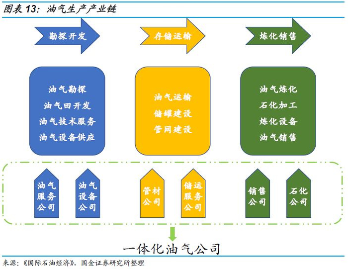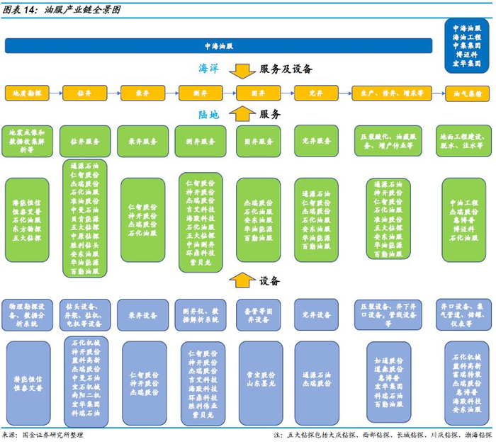 中海油服、石化油服已具备一体化综合服务能力,在各个环节的装备与技术服务均有布局。根据我们对产业链的梳理,目前中海油服、石化油服已布局从地质勘探到油田工程的所有服务板块,杰瑞股份、通源石油、神开股份等公司在多个产业链环节进行布局,未来有望进一步提升综合服务能力。